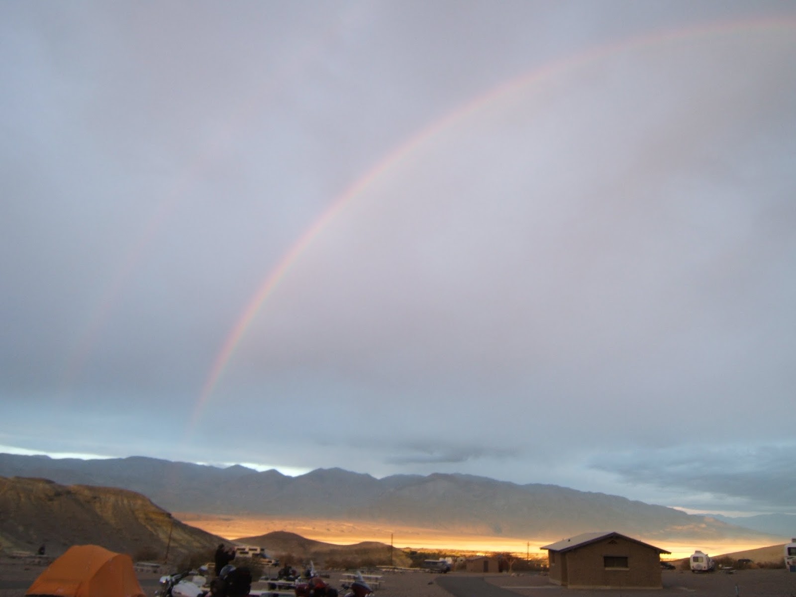 Back at the campsite we enjoyed our biker stew and it was delicious. Jim made 4 different cobblers. I only had a little of the cherry one and it was delicious. That evening we were treated to a lovely sunset and the next morning we arose to a glorious double rainbow over Death Valley.